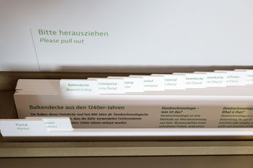 Hands-on-Stationen ermöglichen eine aktive Beteiligung der Besucher:innen: Sammlungsobjekte können erraten und historische Fotografien durchgeblättert werden, Vorher-Nachher-Bilder machen das Ausmaß von Restaurierungsarbeiten sichtbar.